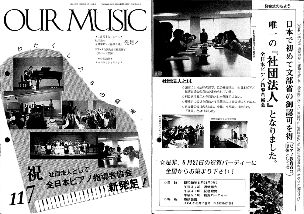 公益性を備えた指導者団体へ文部省(当時)所管の公益法人として認可を受け、株式会社東音企画から独立。ピアノ指導者による自主的な専門団体としての位置づけが明確になり、公益性と社会的信頼を備えた組織として新たな歩みを始めました。