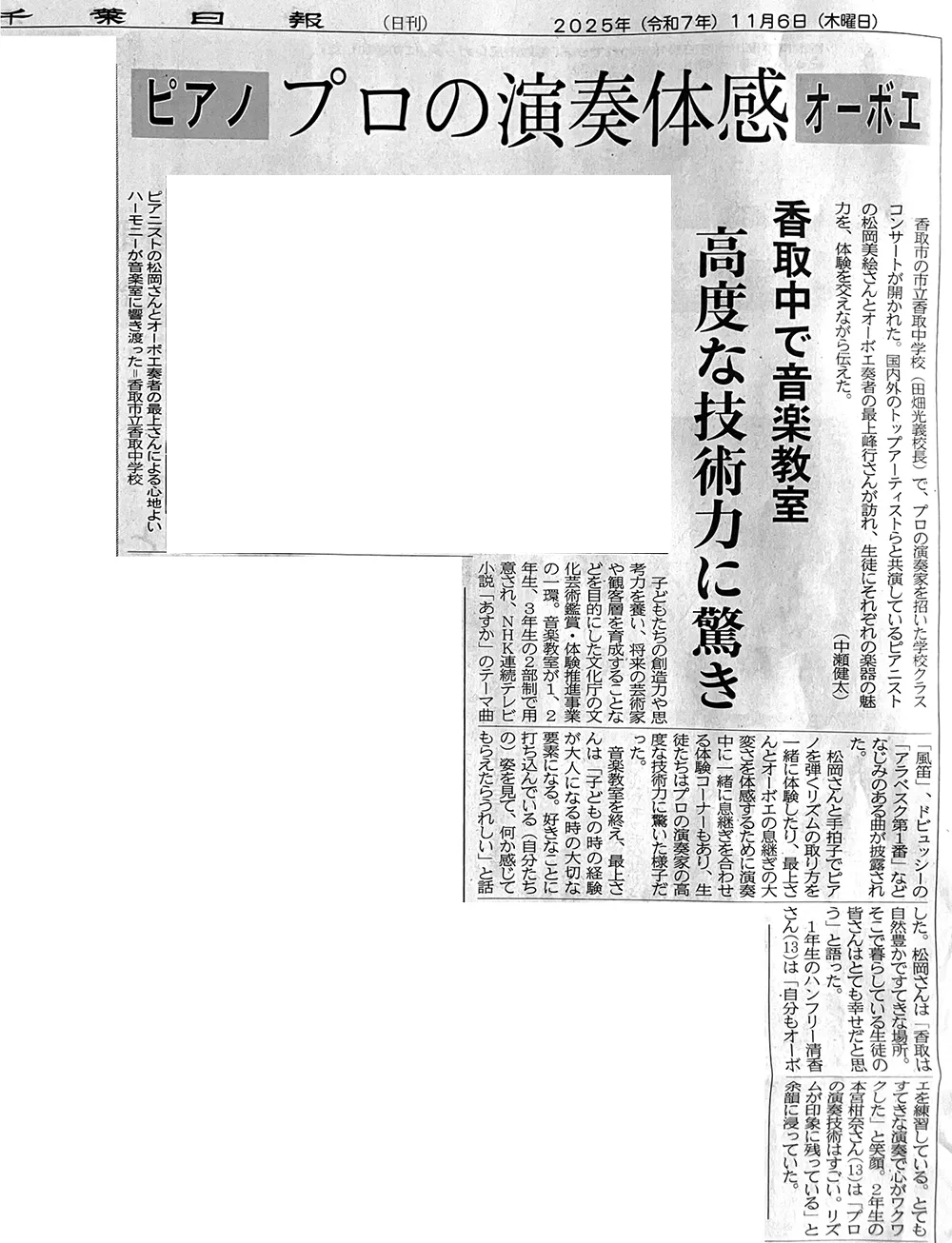 2025年11月6日付の千葉日報にてで、10月23日に香取市立香取中学校で開催された 学校クラスコンサートの様子が紹介されました。